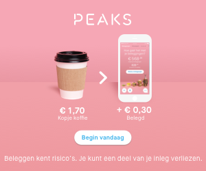 Peaks is een dochter van de Rabobank en een heel leuk en sympathiek platform. En roze 🙂 Van oorsprong belegde je hier met je wisselgeld. Kocht je een coffee to go van €3,55, dan werd dit bedrag afgerond naar €4 en belegde je dus €0,45. Bijna ongemerkt bouw je dan toch een leuk beleggingspotje op.